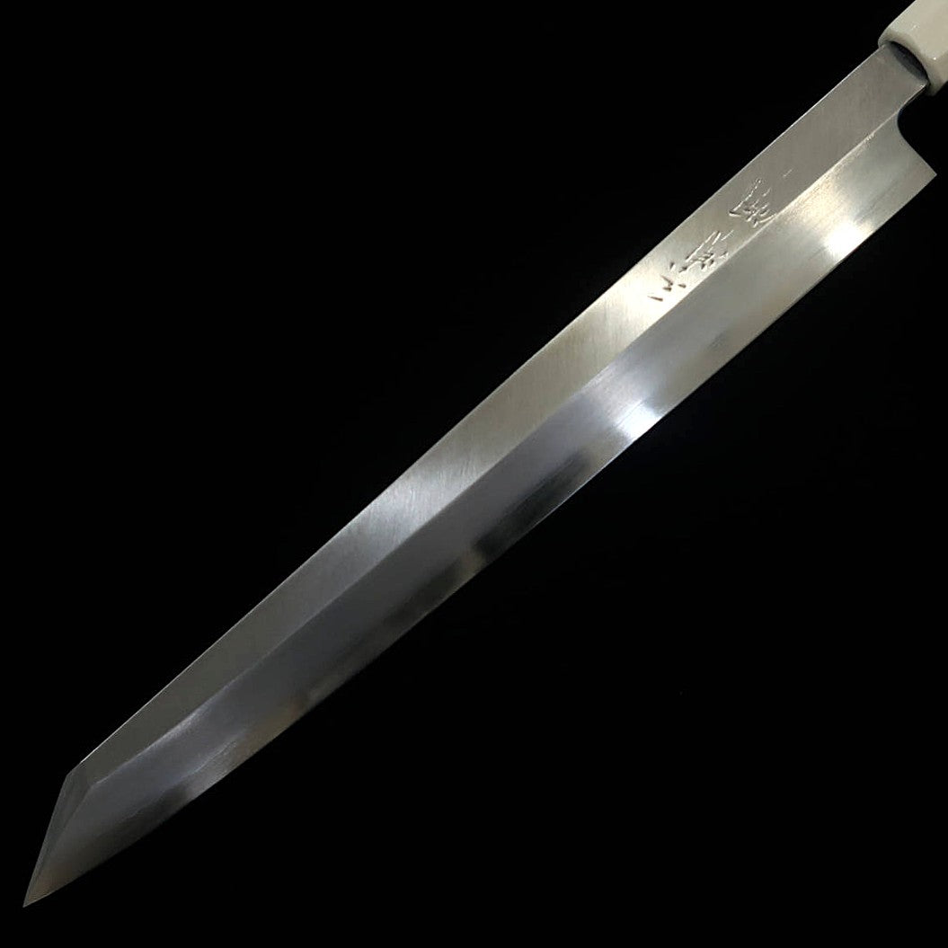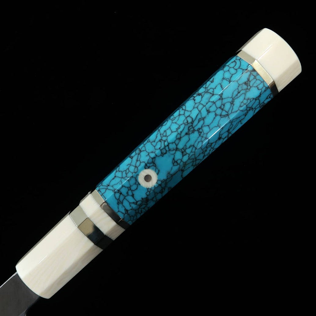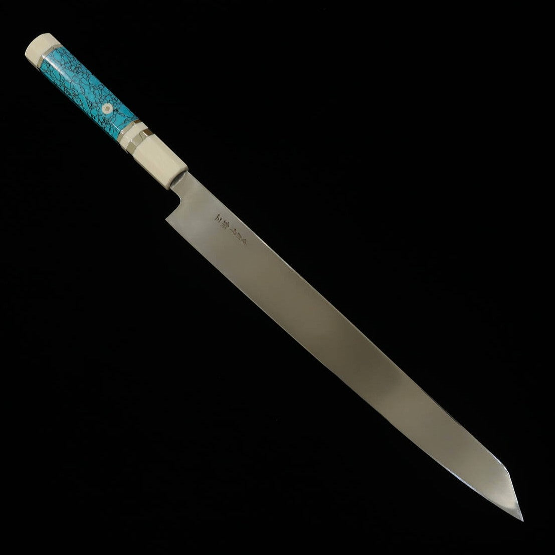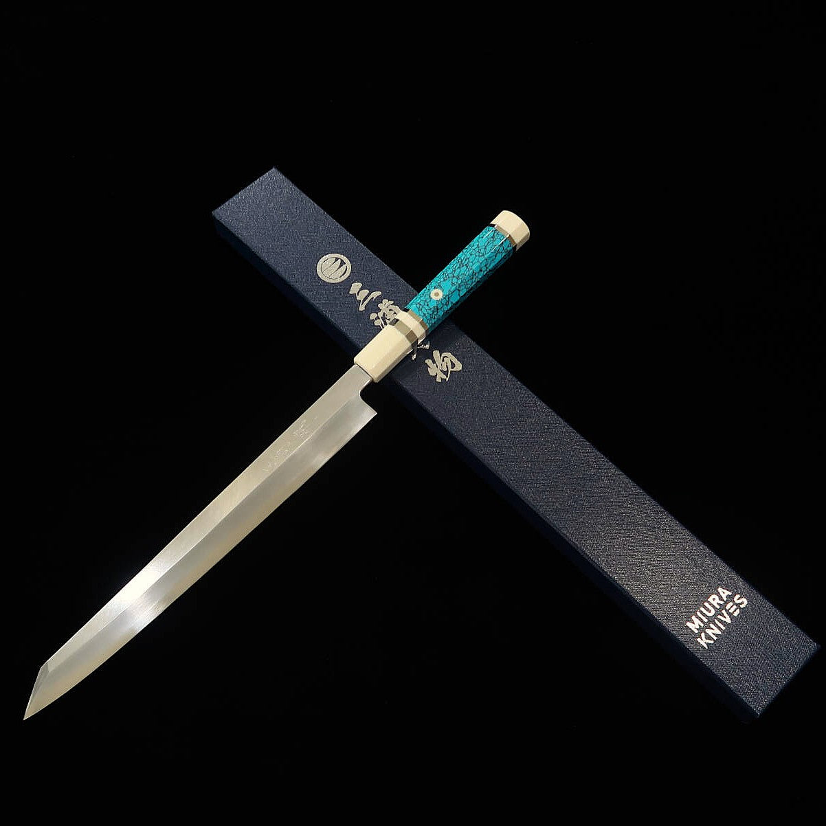 Miura Obidama Kiritsuke Yanagiba Knife, Left-Handed, Ginsan, Kito Finish, Turquoise Handle (300mm)