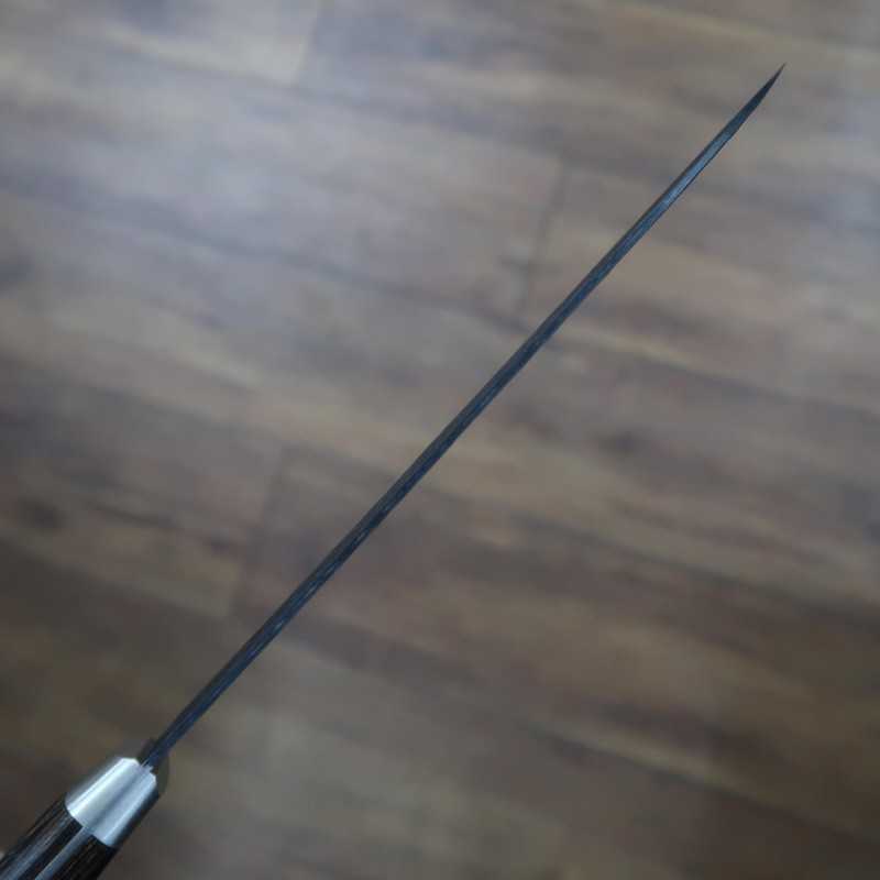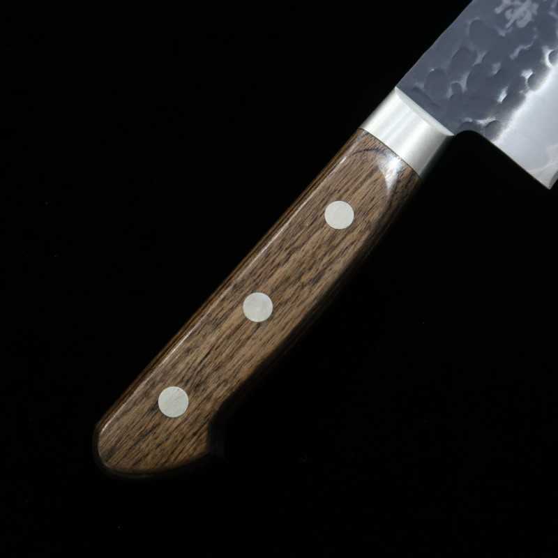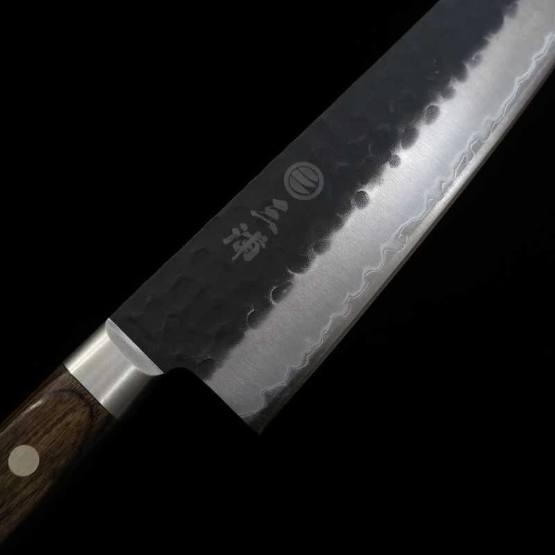 Este cuchillo está hecho de Aogami Super intercalado entre acero inoxidable y acabado con un martillo negro martillado.