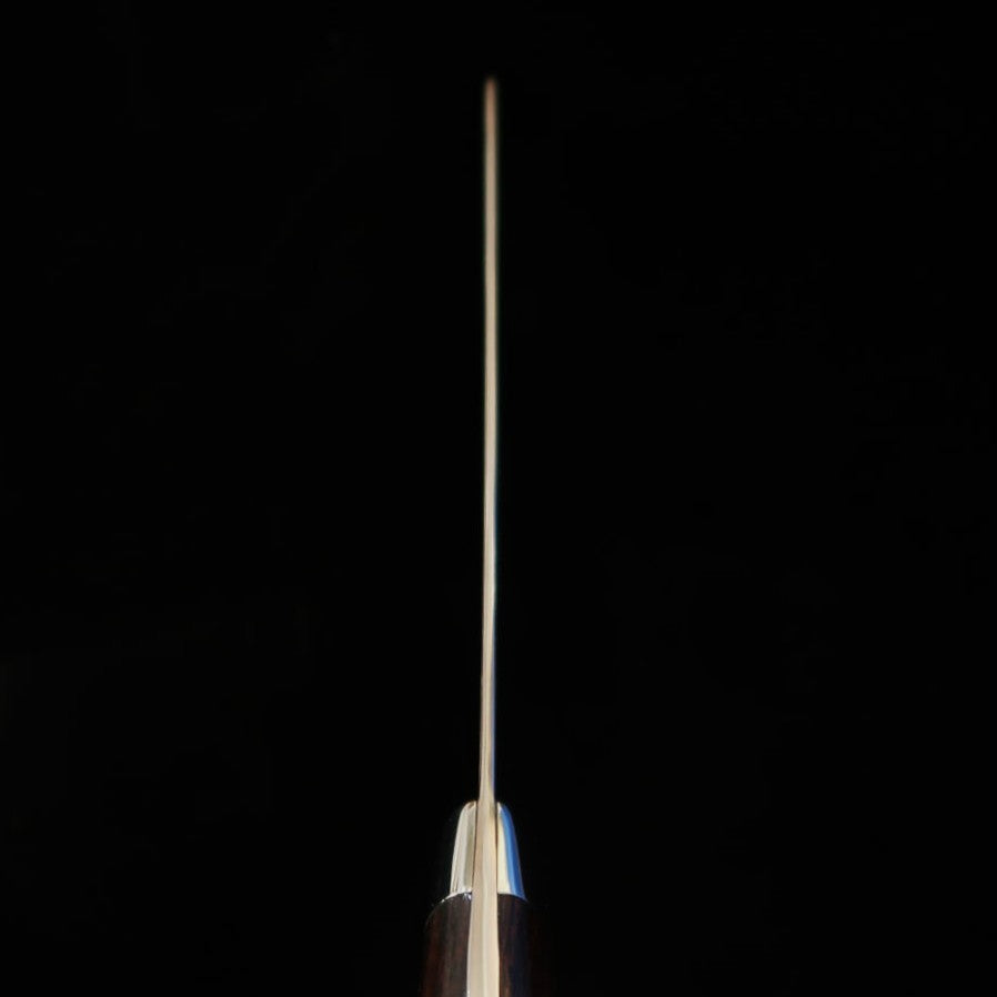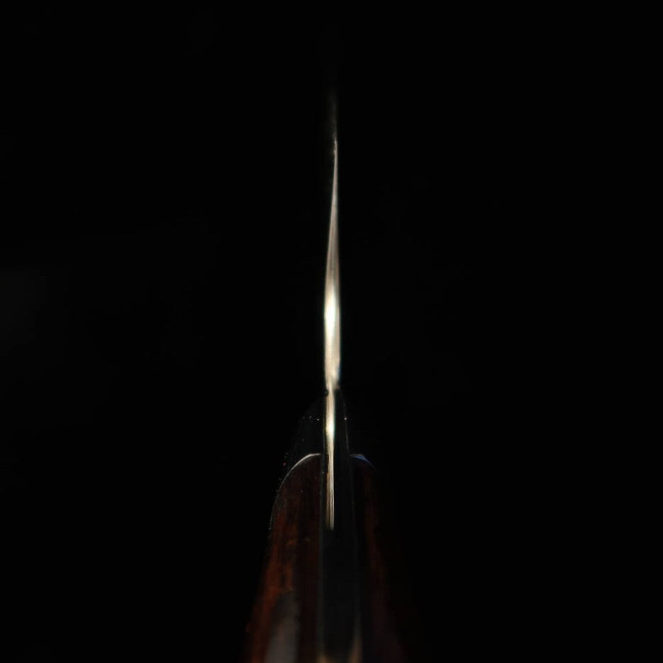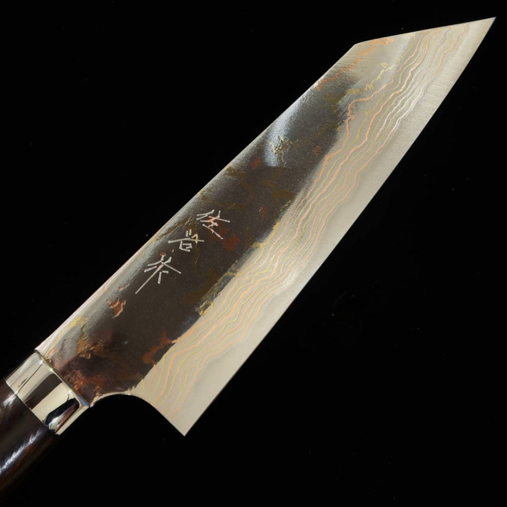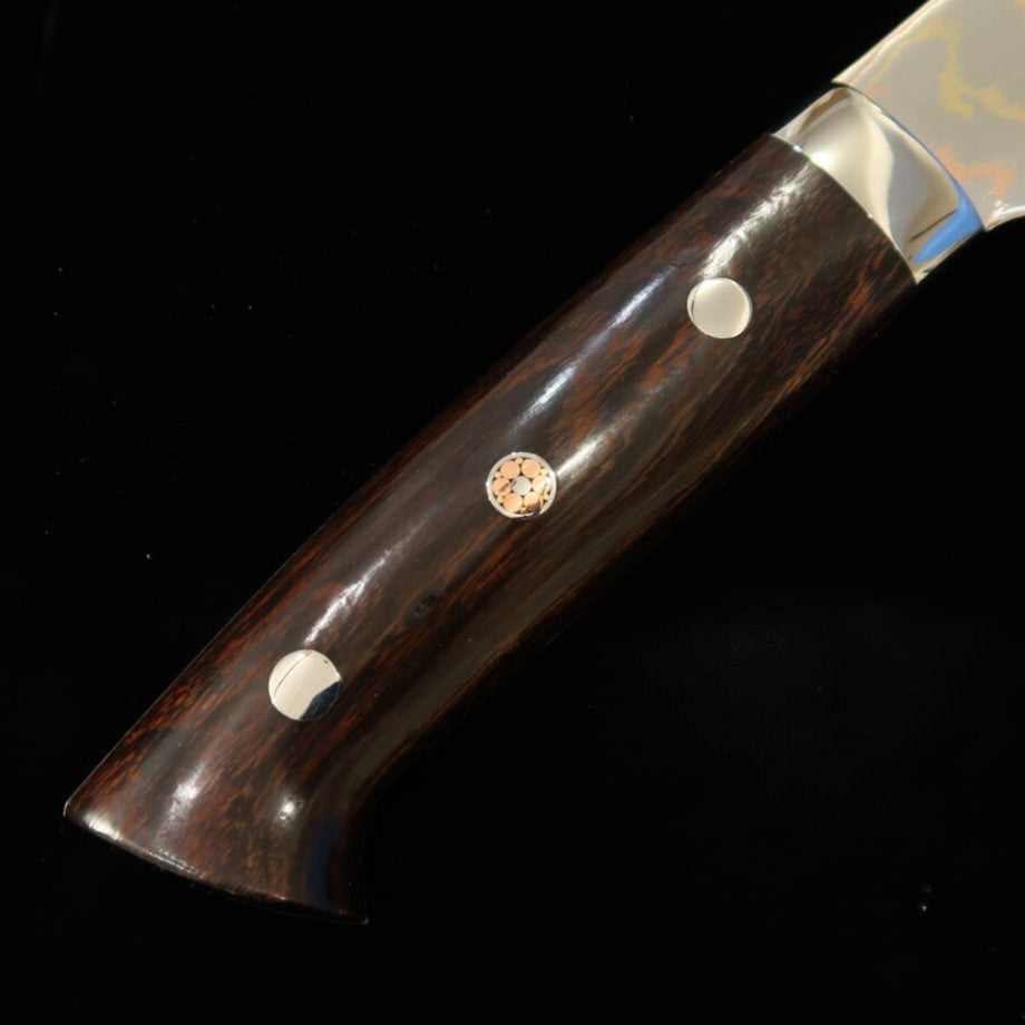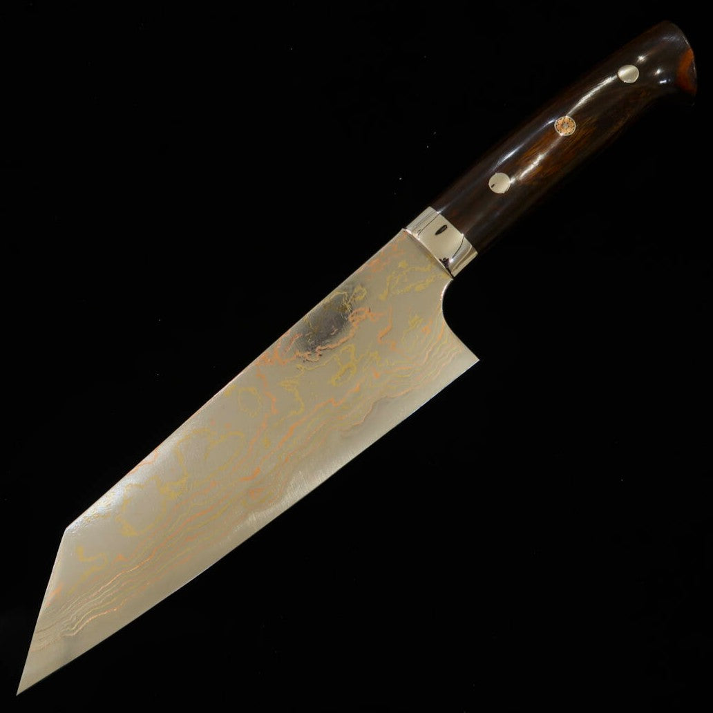 Utilizando acero Aogami como núcleo y cobre en el damasco exterior, se consigue un patrón por su rendimiento, sino también por el placer de poseerlo y utilizarlo.