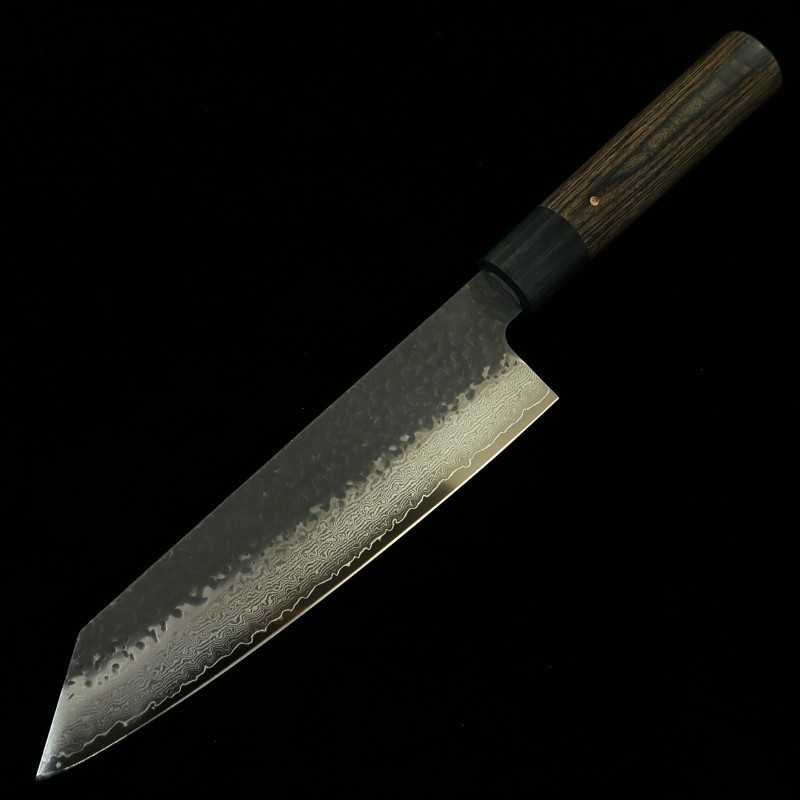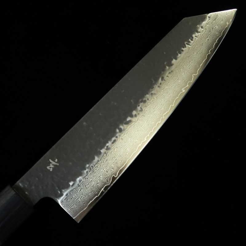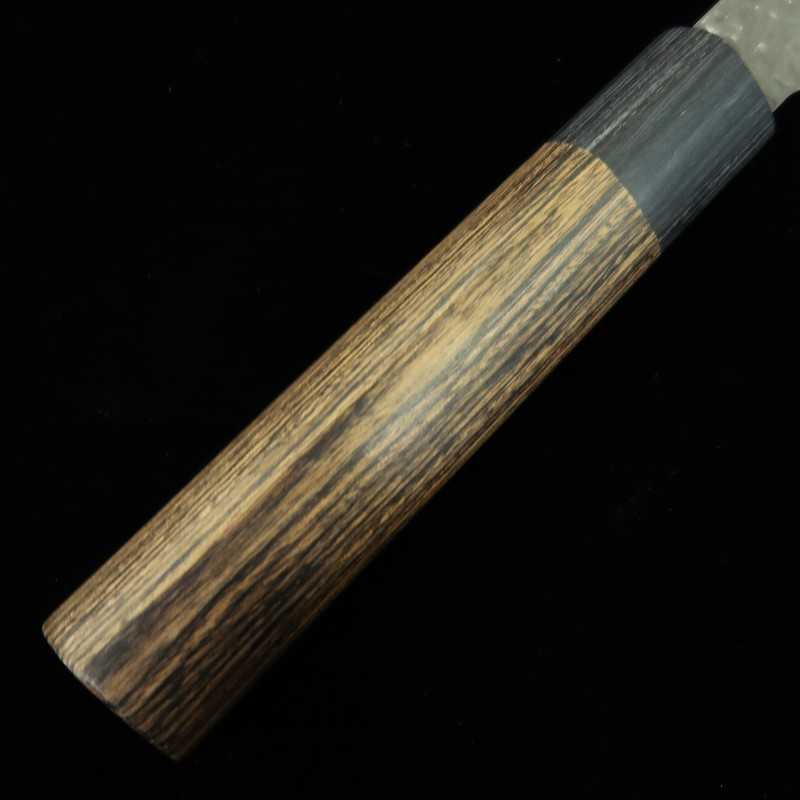 La serie de cuchillos "Gen" de Shizu Hamono, equipada con una hermosa hoja de acero VG10 de alta calidad con acabado martillado negro damasco.