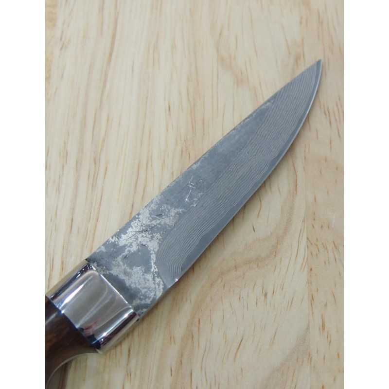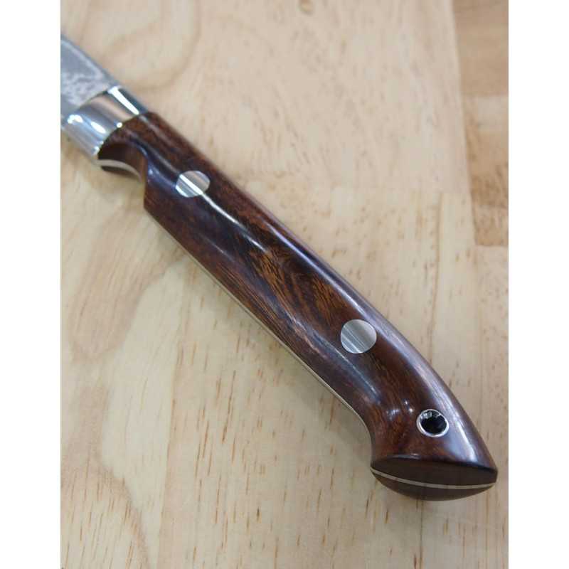 Hoja de VG10 Damasco, de aspecto bello y corte afilado, con un mango perfectamente redondeado y muy cómodo de sujetar, junto con una funda de cuero que asegura el cuchillo. Un acabado profesional en cada detalle.