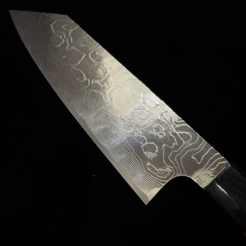 Para el núcleo de la hoja forjada se utiliza VG10, reconocido como acero de alta calidad para cuchillería, y para las capas exteriores un acero damasco con contenido de níquel que realza la belleza del patrón.