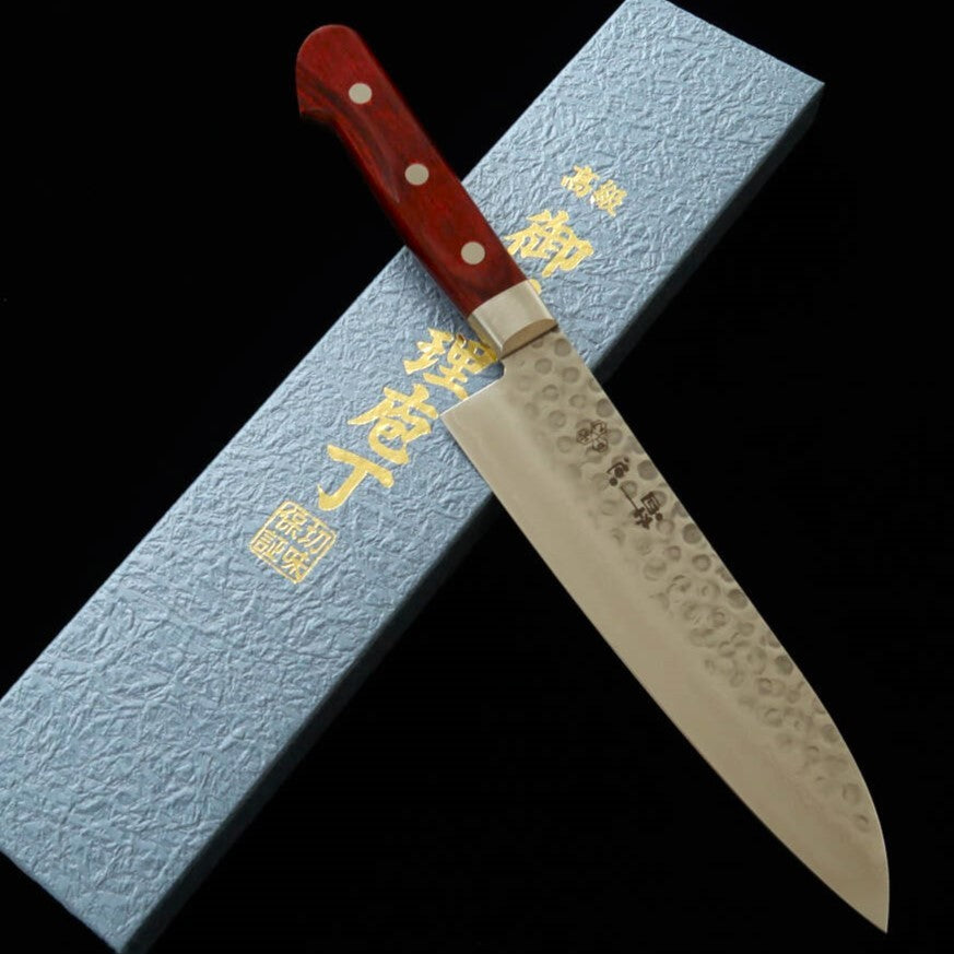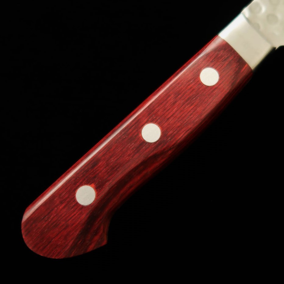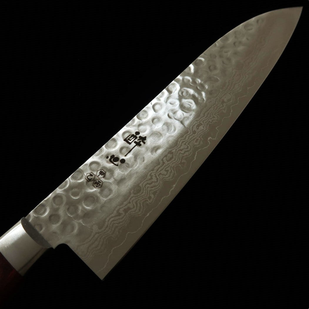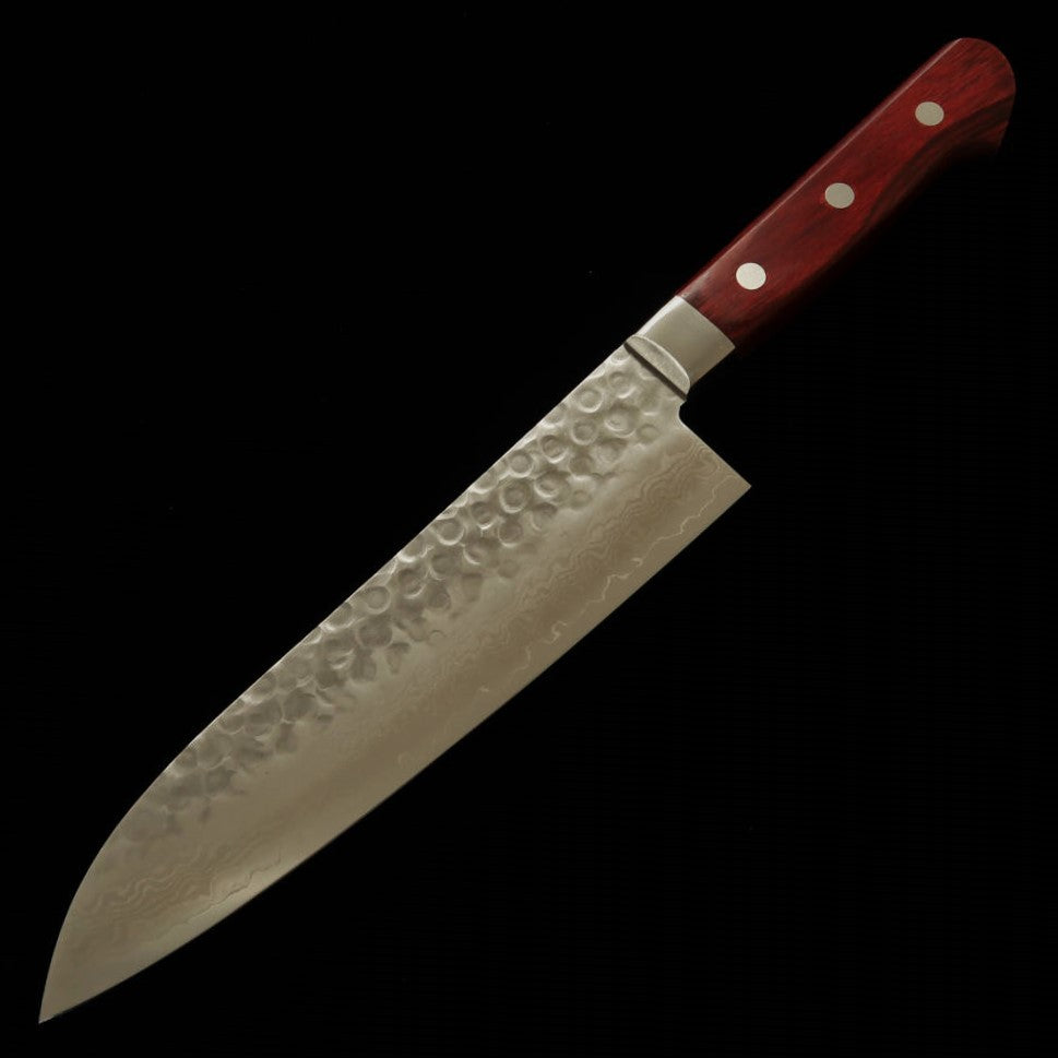La hoja utiliza acero VG-10 de alta gama como núcleo con acabado de damasco martillado.