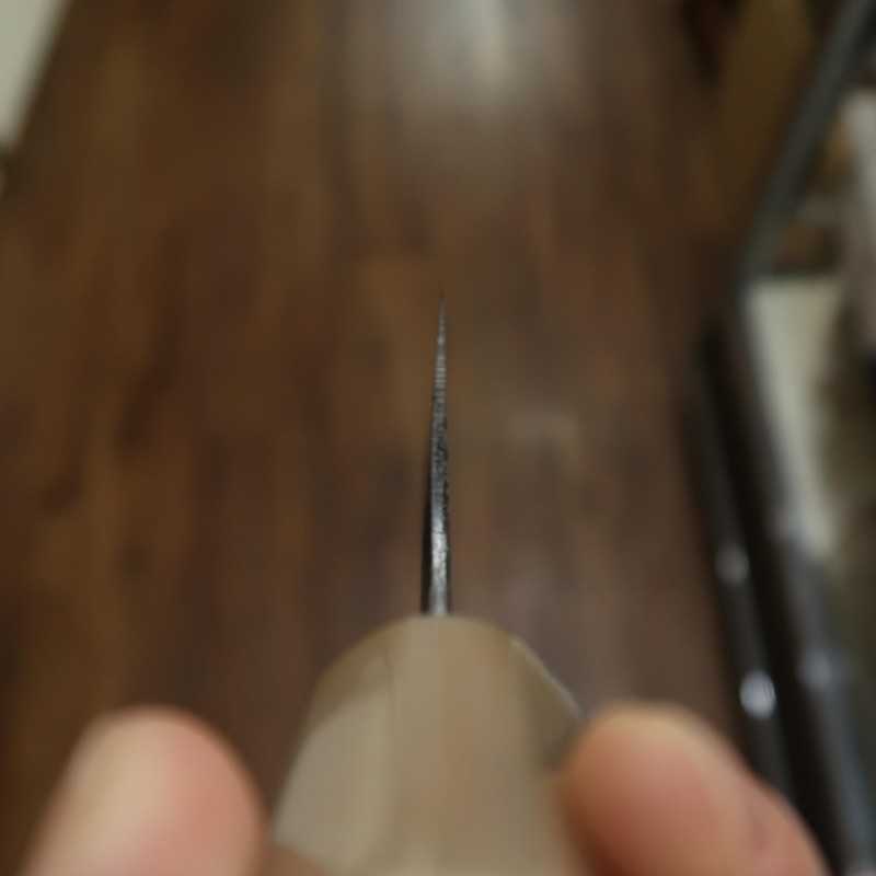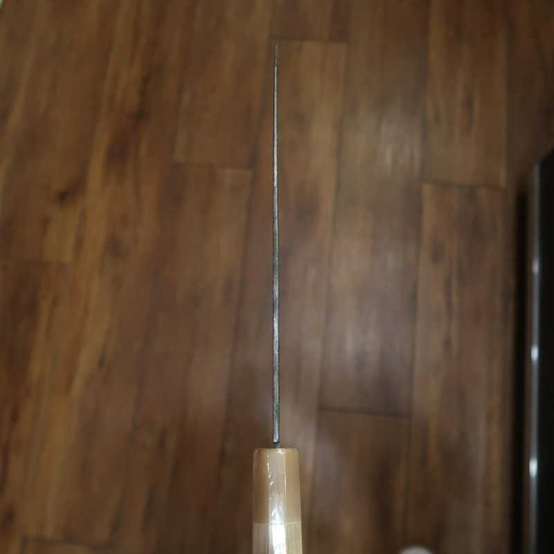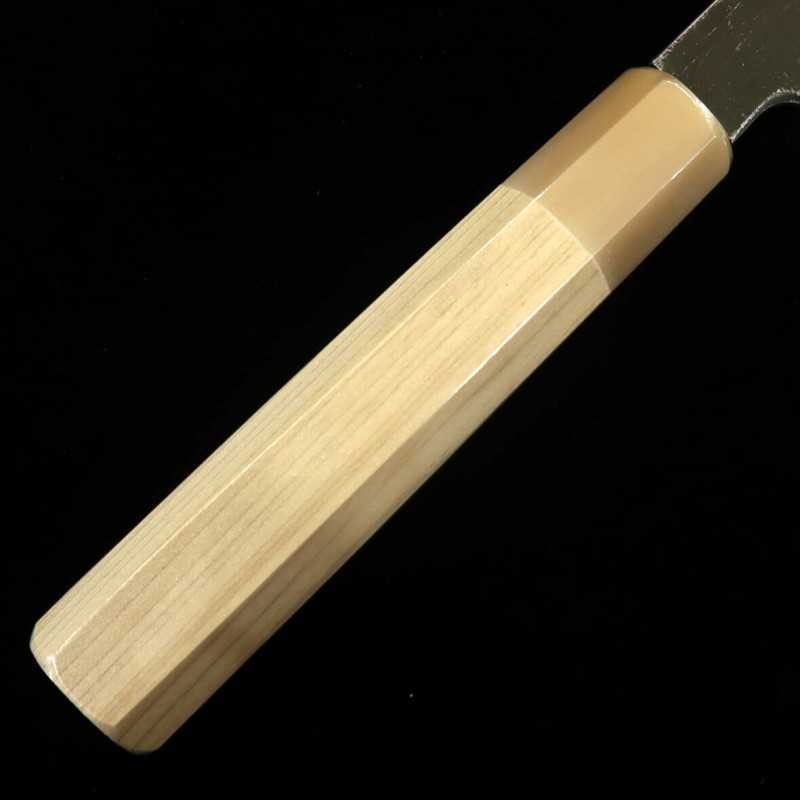 Se utiliza el acero blanco n.º 2, estándar, fácil de afilar y con un filo muy agudo. Las marcas del acabado negro son visibles en la superficie de la hoja.