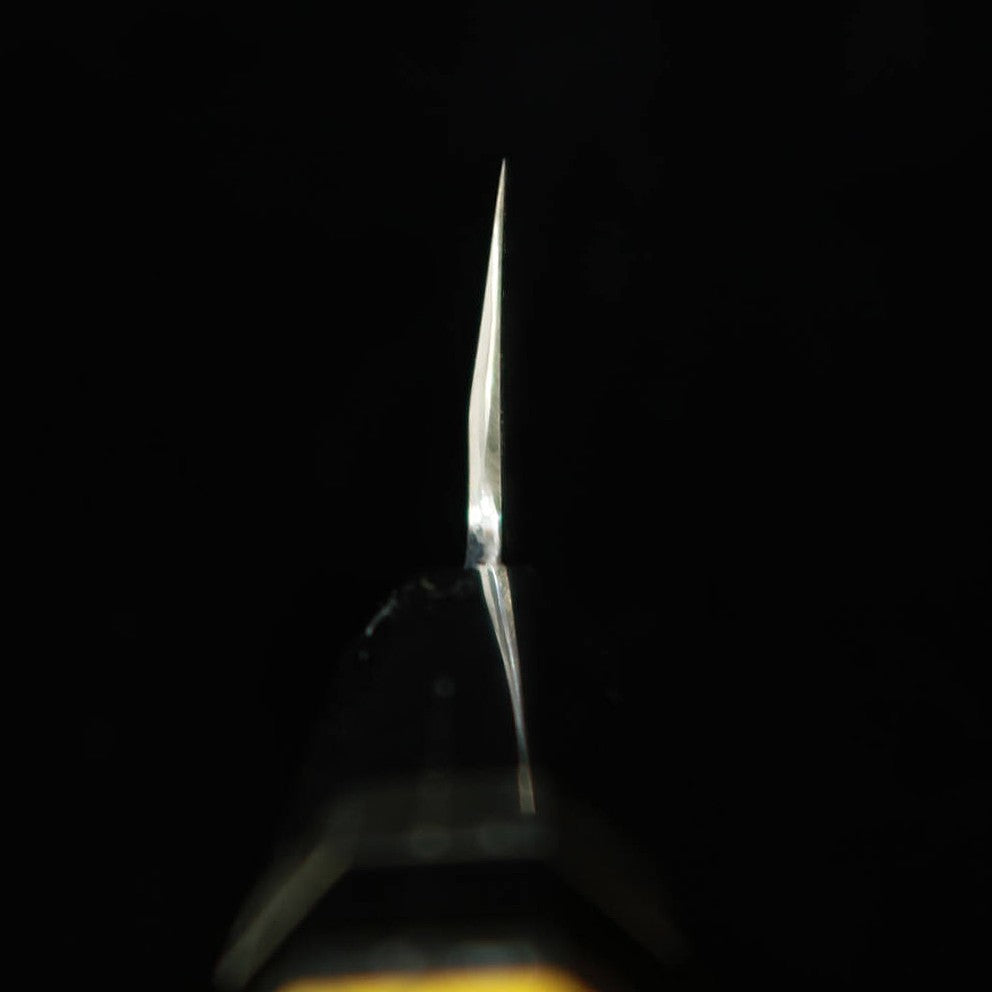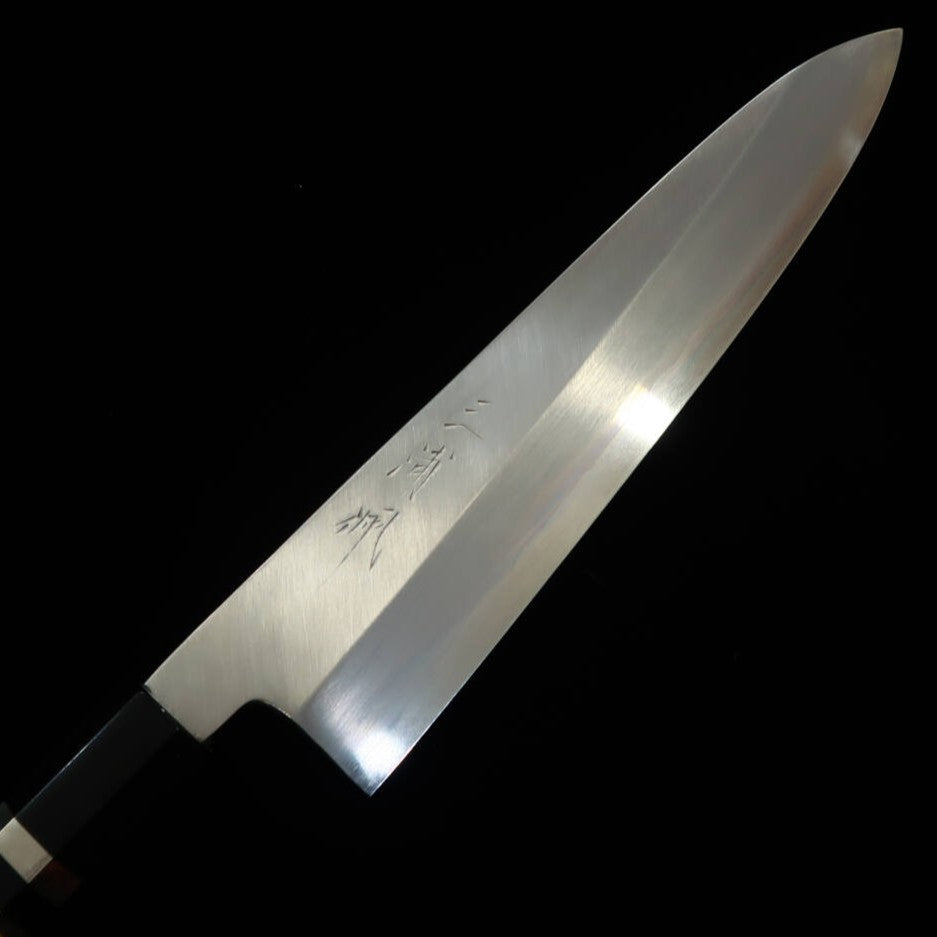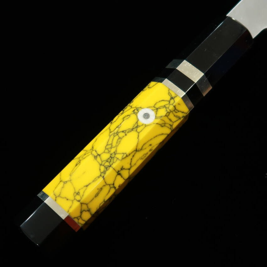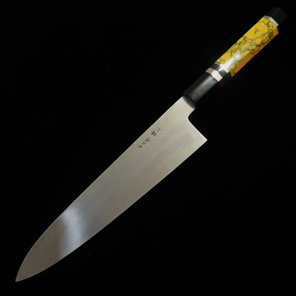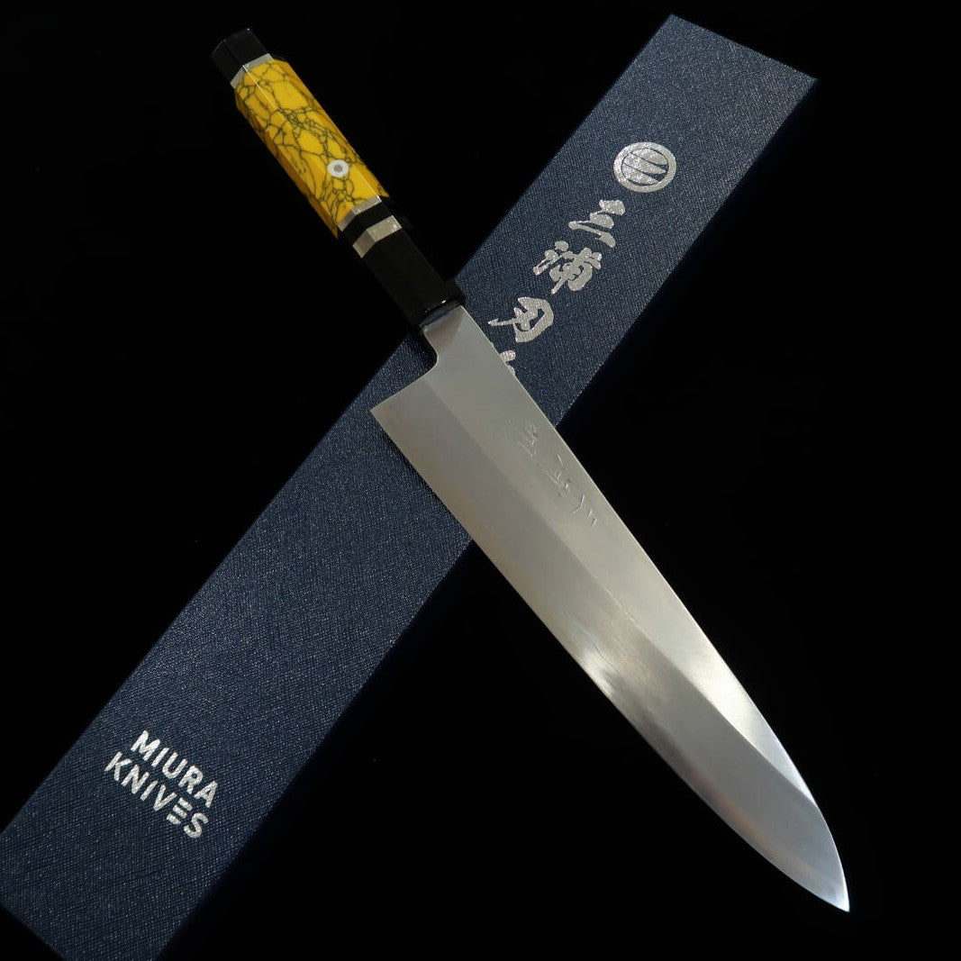 Miura Obidama Gyuto de un solo filo Ginpaku No. 3 acabado en madera mango personalizado amarillo (240mm)