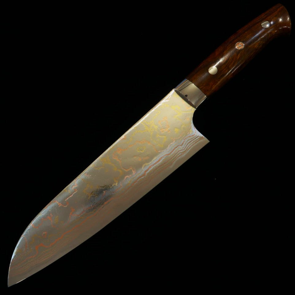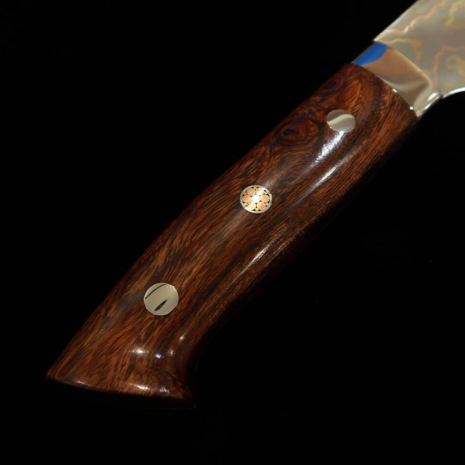 En utilisant l’acier Aogami comme cœur et le damas en fer de peau avec du cuivre, on obtient des motifs damas aux couleurs éclatantes.
