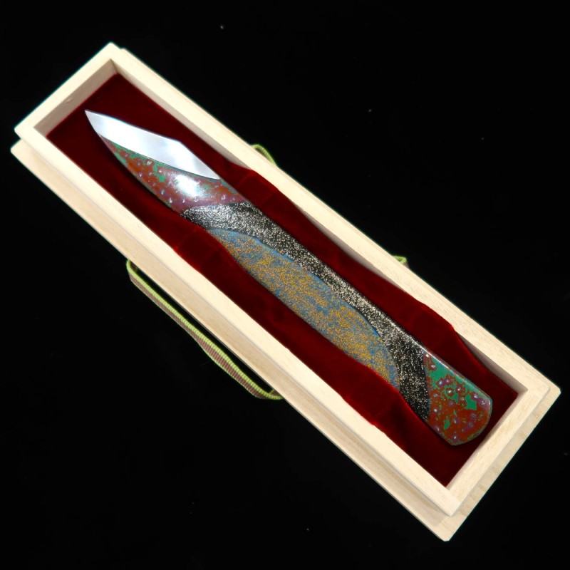 Le « couteau utilitaire Kanekōbō » est fabriqué par forgeage, utilisant du fer brut et de l'acier Yasuki Aogami pour la lame. Ensuite, une laque est appliquée à la surface pour la protéger de la rouille, puis une laque spéciale de finition est appliquée.
