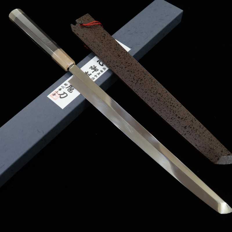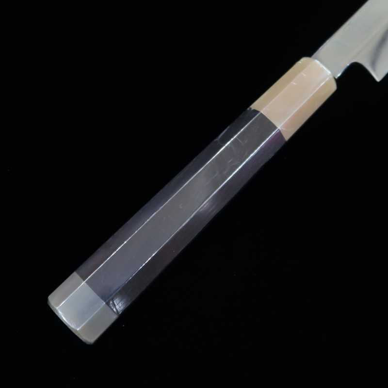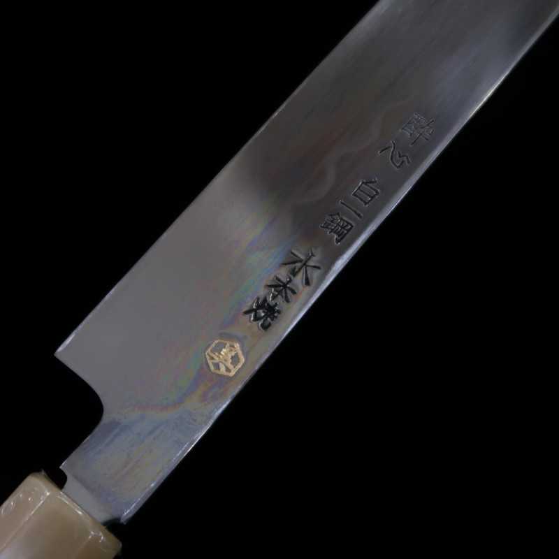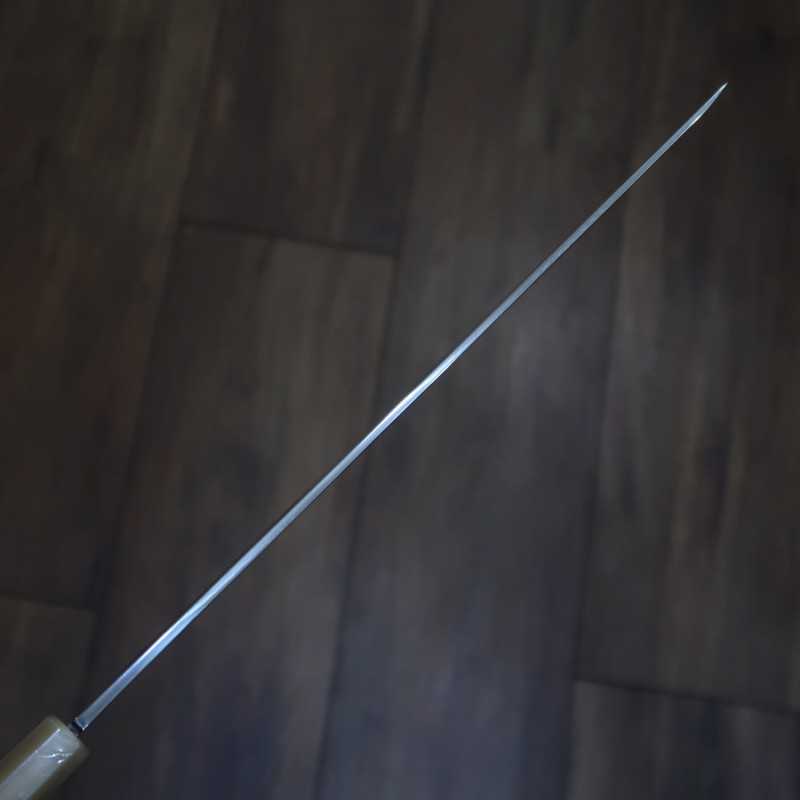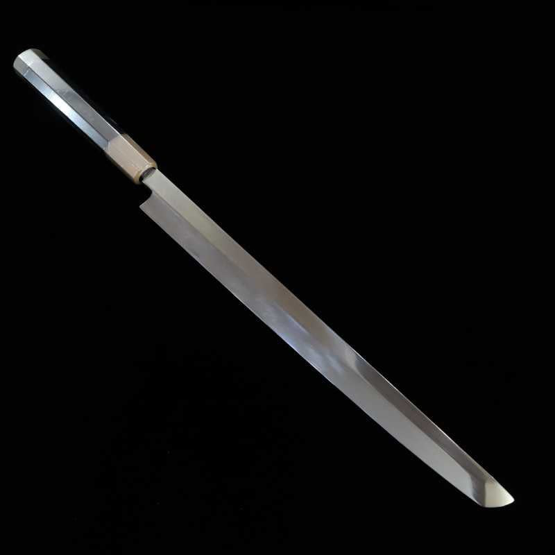 Suishin Ikeda Miwa Couteau Takohiki à bout rond, acier Shirogami n°1, trempe intégrale, finition miroir, fourreau laqué, manche octogonal en ébène (300 mm)