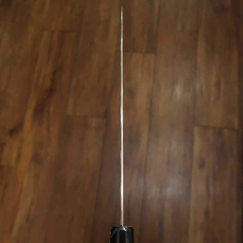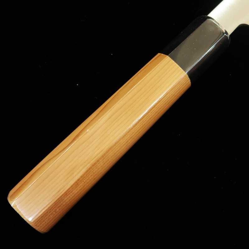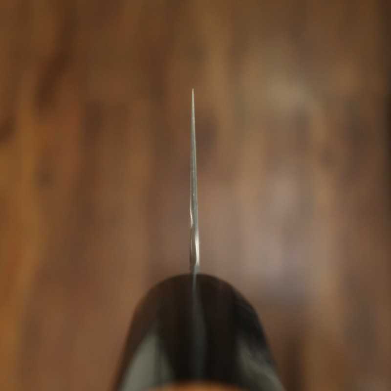 La dureté de la lame, soigneusement aiguisée à la main par un artisan traditionnel de Sakai dans la préfecture d'Osaka, est fixée à HRC61, offrant un tranchant exceptionnel et une facilité d’aiguisage.