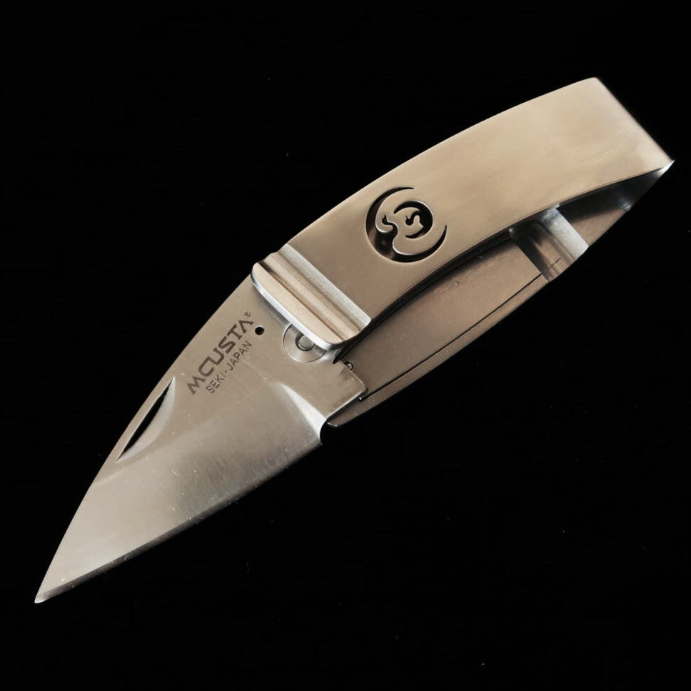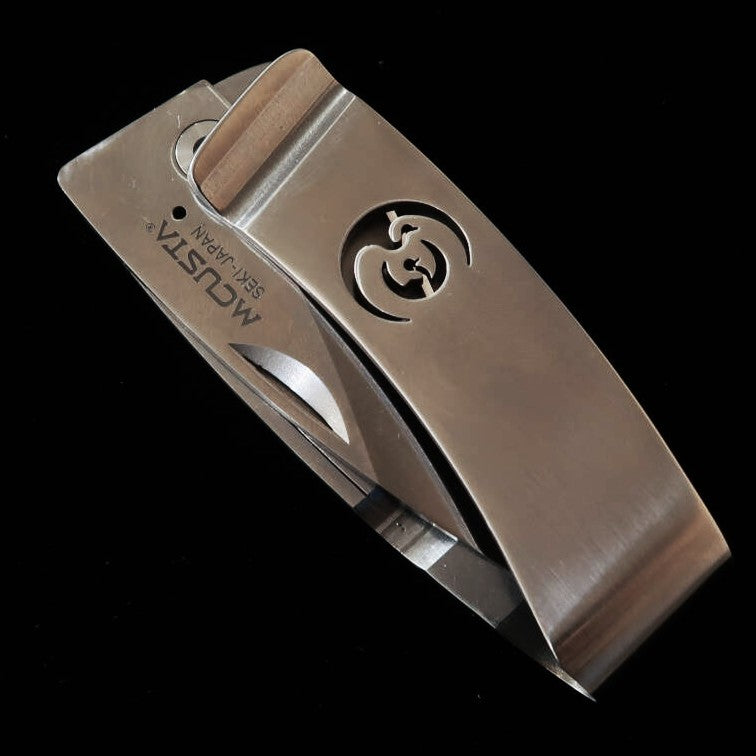 マネークリップとナイフが一体となった本シリーズは、小型でシンプルな構造を持ち、アクセントに家紋が入ります。