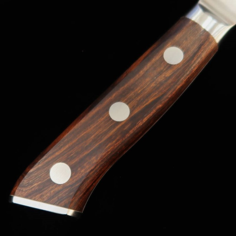 きれいに面取りされた尻金は鏡面仕上げされ、三昧のロゴが入ります。プレミアムはハンドルにアイアンウッドを採用