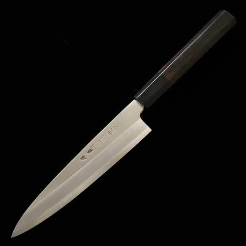 Petty MIURA Itadaki Shirogami No. 2, faca acabamento Shinogi Kasumi cabo octogonal em ébano Yoshikazu Tanaka (150mm)