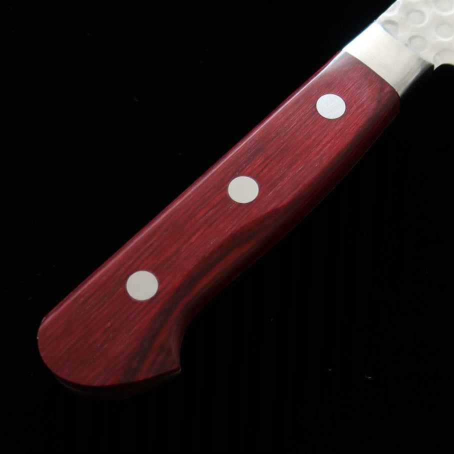 A lâmina utiliza aço VG-10 de alta qualidade como núcleo, com acabamento martelado em Damasco.